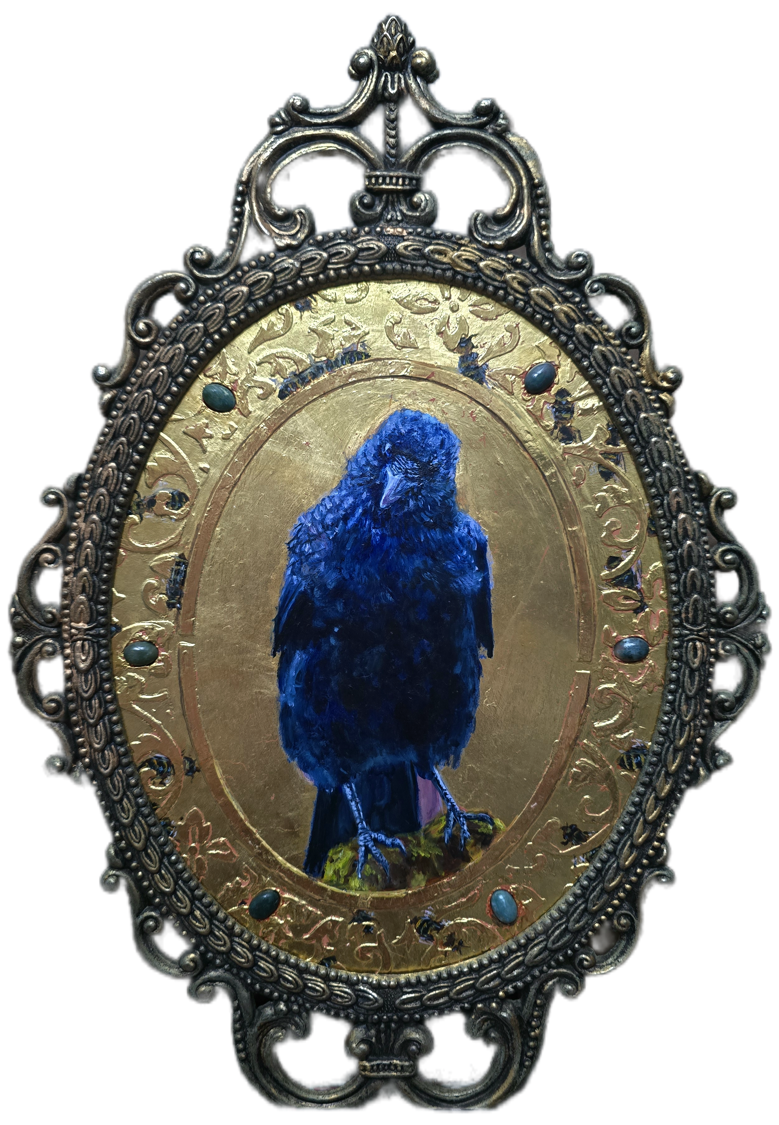 Hand gilded in the Italian “Pastiglia” style, this crow ambassador waits at the hive entry for an audience with the ruling monarch.