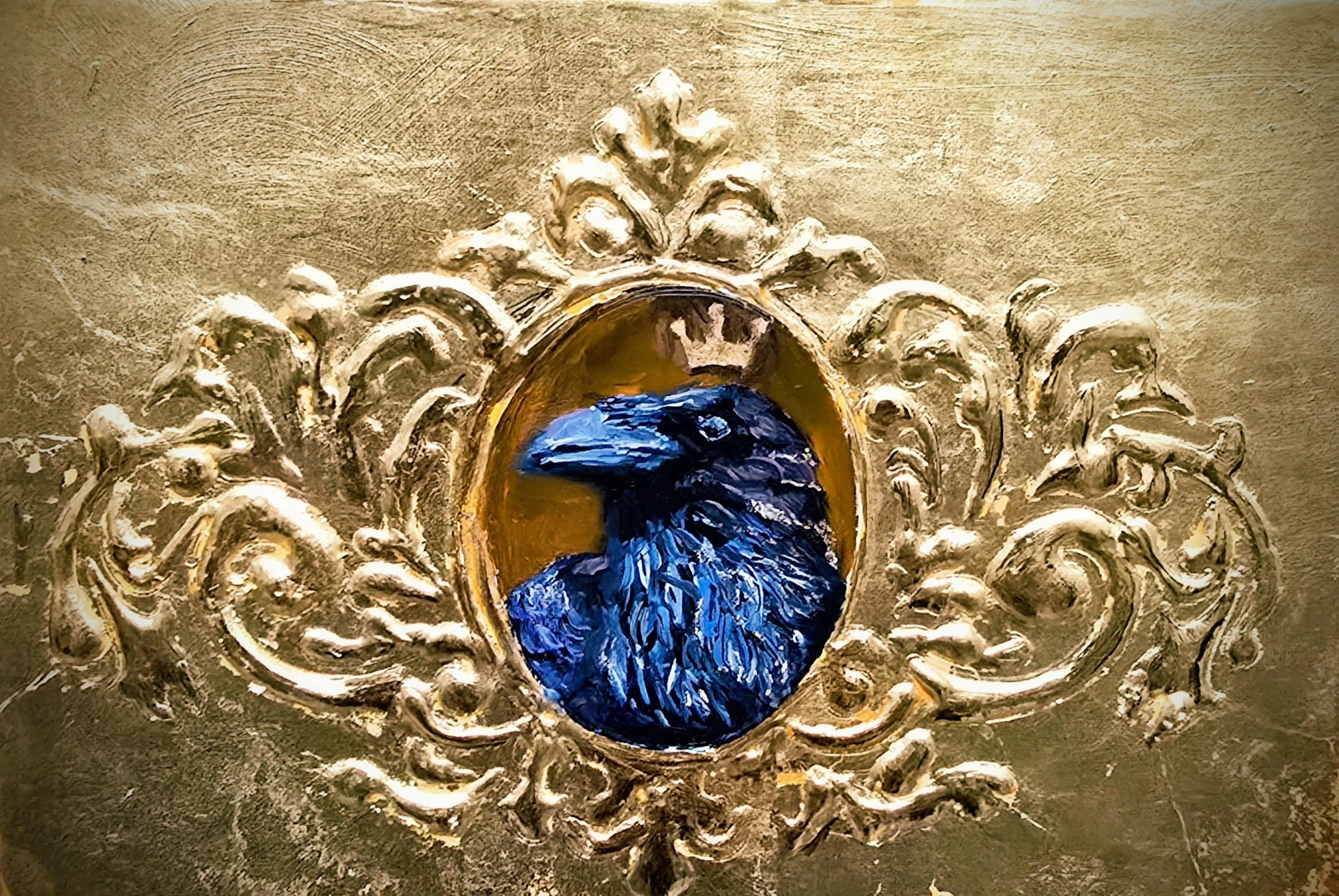 Summary: Hand gilded in the Italian “Pastiglia” style, this crow king had his portrait completed to adorn his abode and look down upon his court