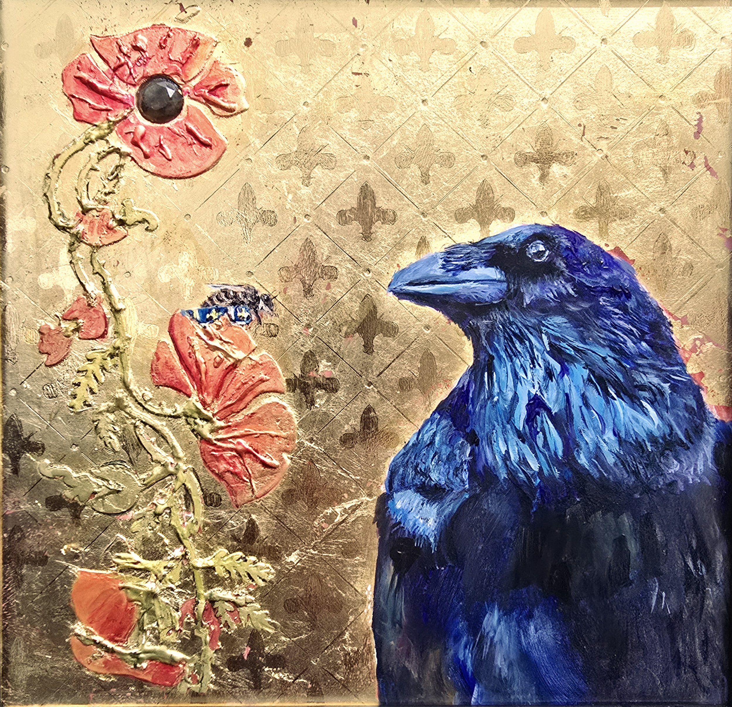 Hand-painted black raven. He is the crow king in my series. He ventured to meet with the queen bee and parlay. The queen rests on her crown atop a pastiglia poppy surface. The poppy has a heart of faceted quartz. Comes framed.