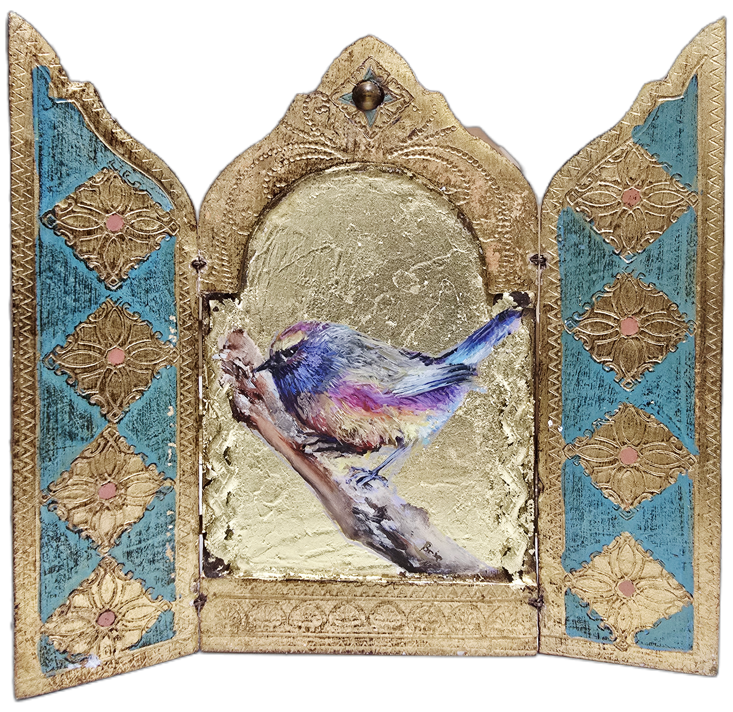 Summary: Hand gilded on a vintage Florentine hinged triptych. The white browed tit warbler sits in anticipation of your reverence.